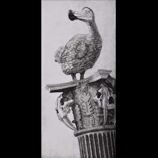 The Human Touch II” 6″x13″ $80 Zinc etching using the Dodo bird as a symbol of something that can go very wrong, very fast; the result of human intervention. Created by Steve Nowatzki